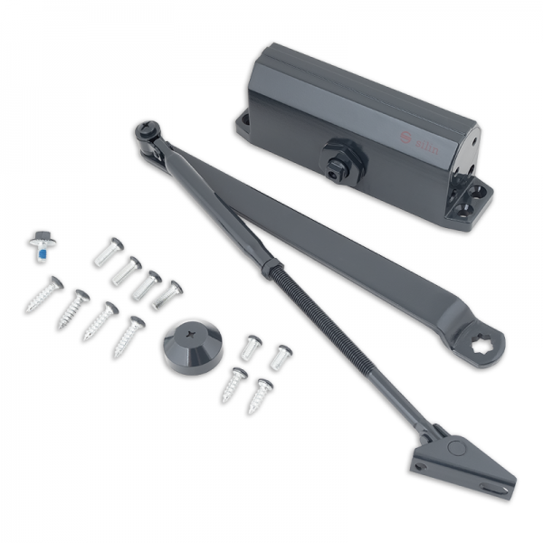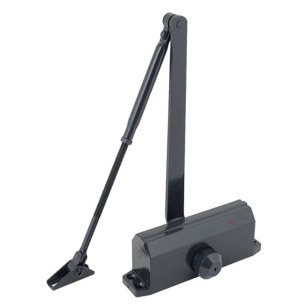 Amortizor hidraulic cu brat pentru usi de la 40kg pana la 65kg. Latimea maxima a foii de usa 950 mm. Permite ajustarea vitezei de inchidere si blocare a usii. Disponibil in patru variante de culoare: maro, argintiu, alb, gri antracit.