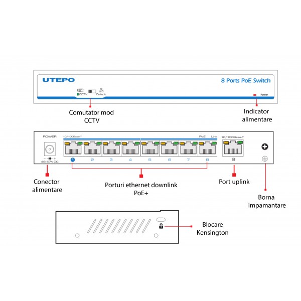 UTP1-SW0801-TP120 * Switch ethernet PoE+, 8 porturi 10/100 Mbps POE+ downlink, 1 port 10/100 Mbps uplink