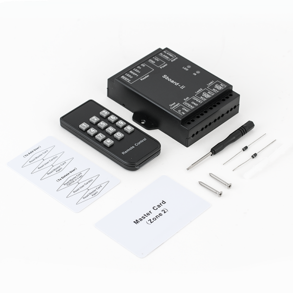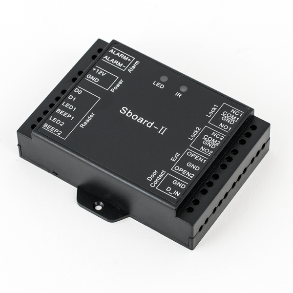 S-Board2 este un modul de control acces cu doua relee. Functioneaza cu orice cititor Wiegand 26-37bit (selectabil). Modulul este echipat un cu microprocesor Atmel ce confera o stabilitate buna si o durata mare de folosire. Suporta pana la2100 de utilizatori, transferabili prin interfata Wiegand pe alte module (SBoard, S1-X). Configurarea se face cu ajutorul telecomenzii IR incluse.