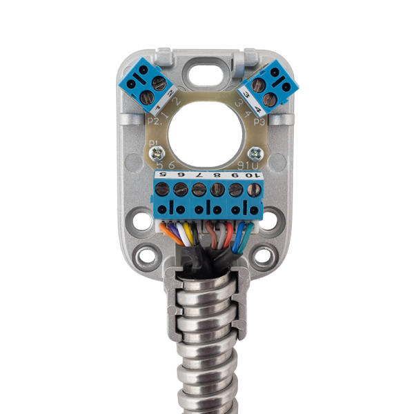 Protectie de cablu cu cablu incorporat si bloc terminal cu 10 borne. Instalarea este rapida si usoara datorita cablului incorporat si bornele de conectare.