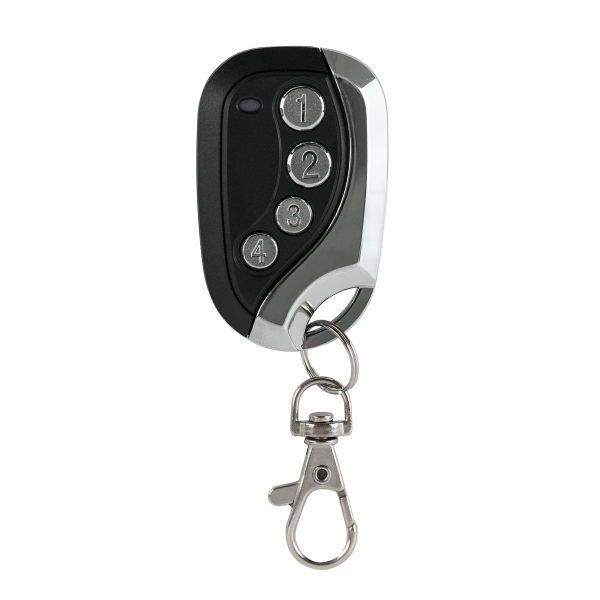 AJ-84-C4M este o telecomanda radio cu patru butoane numerotate, compatibila cu receptoarele radio din seria AJ84-x si AJ-83-x. Poate fi agatata cu usurinta la chei sau curea datorita carabinei rotative.
